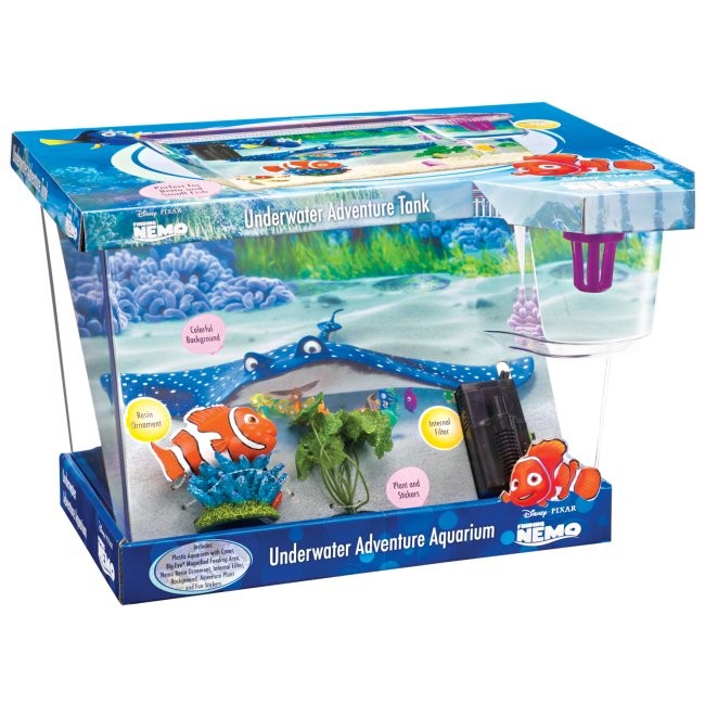 This aquarium kit includes an opening lid, background, silk plant, Finding Nemo ornament, fun stickers, gravel and internal filter. The aquarium features a "Big Eye" magnified feeding area for a closer view of the action inside. So create your own home aquarium (freshwater only) with all the fun and characters of Disneys Finding Nemo!