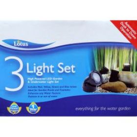 Lotus Triple LED Pond Spot Lights come with three lights, all cables, transformer, automatic dusk to dawn operation.