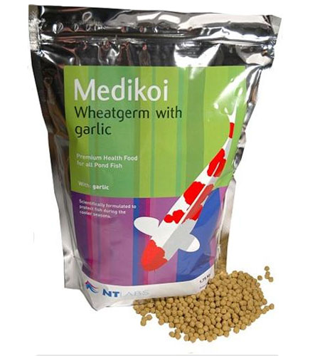 •  Is a reduced protein maintenance food with garlic, for protection from fish parasites over cooler months. The addition of garlic diffuses through the skin of the fish and any parasites which may be present react to these compounds by swimming away, reducing the risk of infestation. When rapid growth is not a priority, Medikoi Wheatgerm with Garlic can be fed throughout the year. It can be used to help stimulate the appetite if fish have been moved or "gone off their food" and will encourage them to feed again quickly.