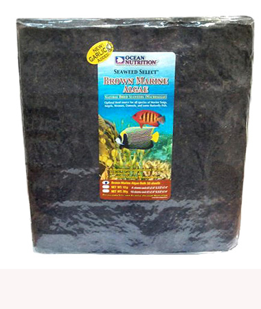 As with the Ocean Nutrition Green Marine Algae, the brown marine algae is ideal as a supplement to the food source you already use for your fish. It is also worth considering as a holiday food and can be used by attaching to feeding clips or folding the seaweed around an elastic band. It is recommended that you use a 2 inch by 3 inch piece in a community aquarium of 55 Gallons. It is also advised that if any pieces of the seaweed become loose and float to the surface then they should be re attached to the elastic band and also if the seaweed is left over 6 hours then it should be scooped out and discarded. The Brown Marine Algae is suitable for :- Marine Tangs, Angels, Wrasses, Damsels and some Butterfly Fish. Ingredients:- 100% Dried Seaweeds, 100% Digestible and rich in vitamin C. 50 sheet bulk pack, each sheet approx. 20cm x 20cm. Approximate total weight per pack 180 grams.