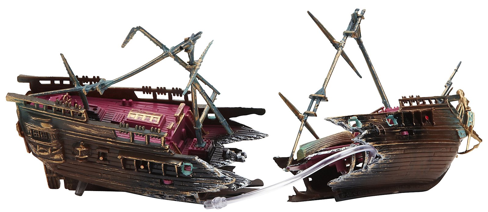 The Penn-Plax Split Shipwreck brings your aquarium to life. This ornament does more than enhance the look of your underwater environment, it also features realistic motion to add additional dimension. Requires the use of an air pump and a gang valve. Measures approx 10 x 7 inch