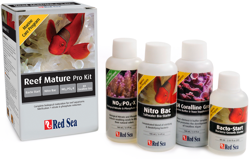 Most biological ‘cycling’ products only provide the bacteria that convert toxic waste products to nitrate. Red Sea’s Reef Mature Pro Kit completes the biological maturation process by establishing thriving colonies of anoxic (de-nitrifying and phosphate harboring) bacteria as well as ensuring the necessary conditions that will promote the growth of coralline algae and other micro fauna found in live rock and within a sand bed.