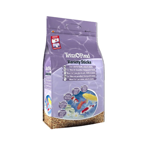 Tetra Variety Sticks contain a blend of: Floating Food Sticks: an ideal, basic diet. Koi Sticks: enhances natural colouration. WheatGerm Sticks: for health and vitality. For spring, summer, and fall feedings. Mix of food sticks for a complete and varied diet. Fish enjoy a little variety in their diet, just as we do. In addition, many ponds contains a mixture of different fish species, which have slightly different nutritional needs. TetraPond Variety Sticks have been formulated to offer both variety and a mix of food formulas, and is suitable for all pond fish. Reasons to feed Tetra Variety Sticks Ideal for ponds containing a mixture of different fish. Low waste formula for clean, clear water. Contains all nutrients, vitamins, and trace elements for a balanced, healthy diet. Softens quickly for easy eating. Gives fish a varied and interesting diet. Feeding guide Feed TetraPond Variety Sticks 2-4 times a day (depending on the temperature), Feed only as much as the fish will consume within a few minutes. Below 10°C, stop feeding TetraPond Variety Sticks and switch to TetraPond Wheatgerm Sticks.